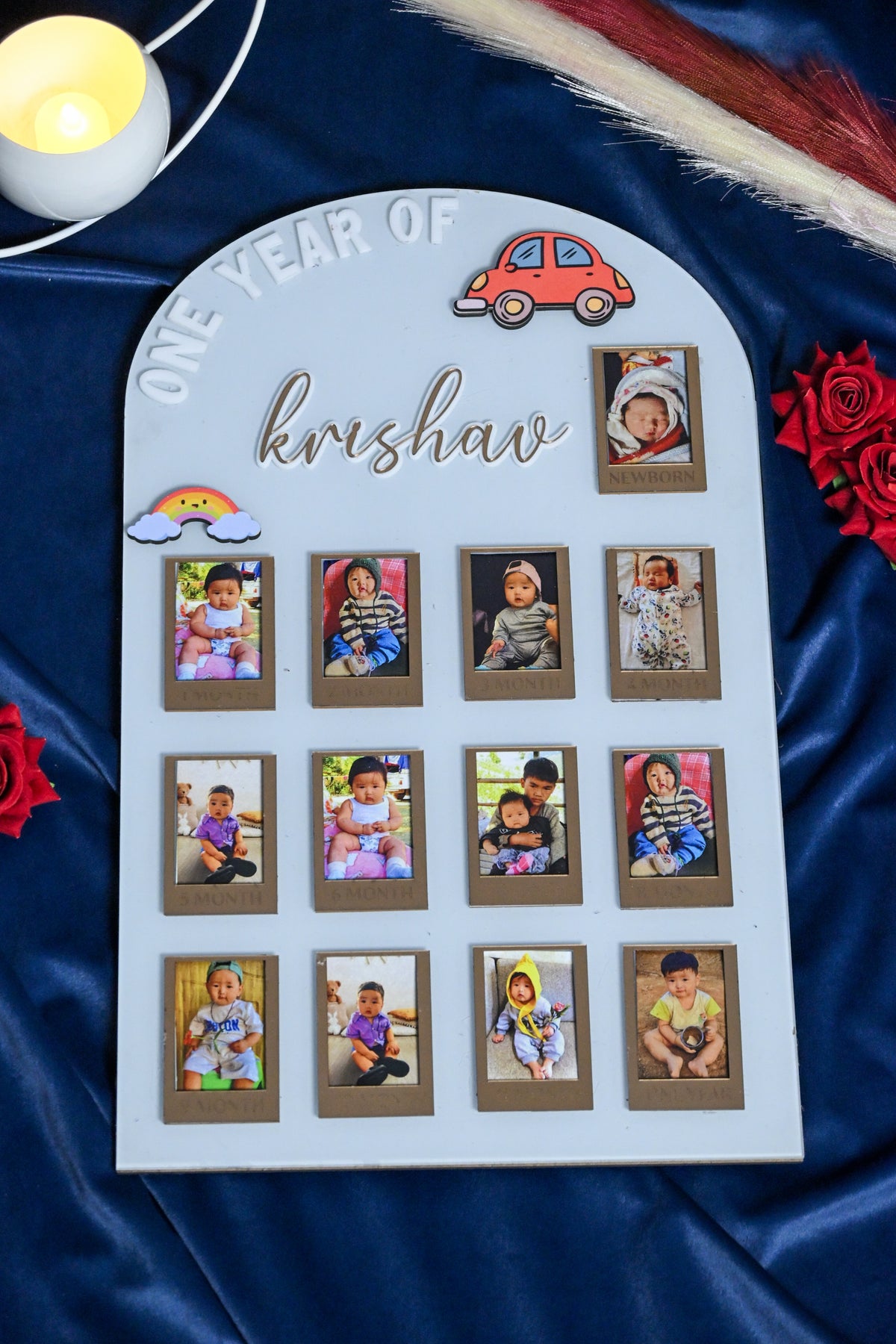 Made with exceptional craftsmanship, the board features a sturdy high-quality MDF base, ensuring durability that lasts for years. The acrylic customizations add a glossy, premium touch—creating a modern, luxurious look that instantly elevates your space. Each month has its own dedicated space to hold photos from newborn to 12 months, capturing the growth of your little one in a visually stunning timeline you’ll treasure forever.
