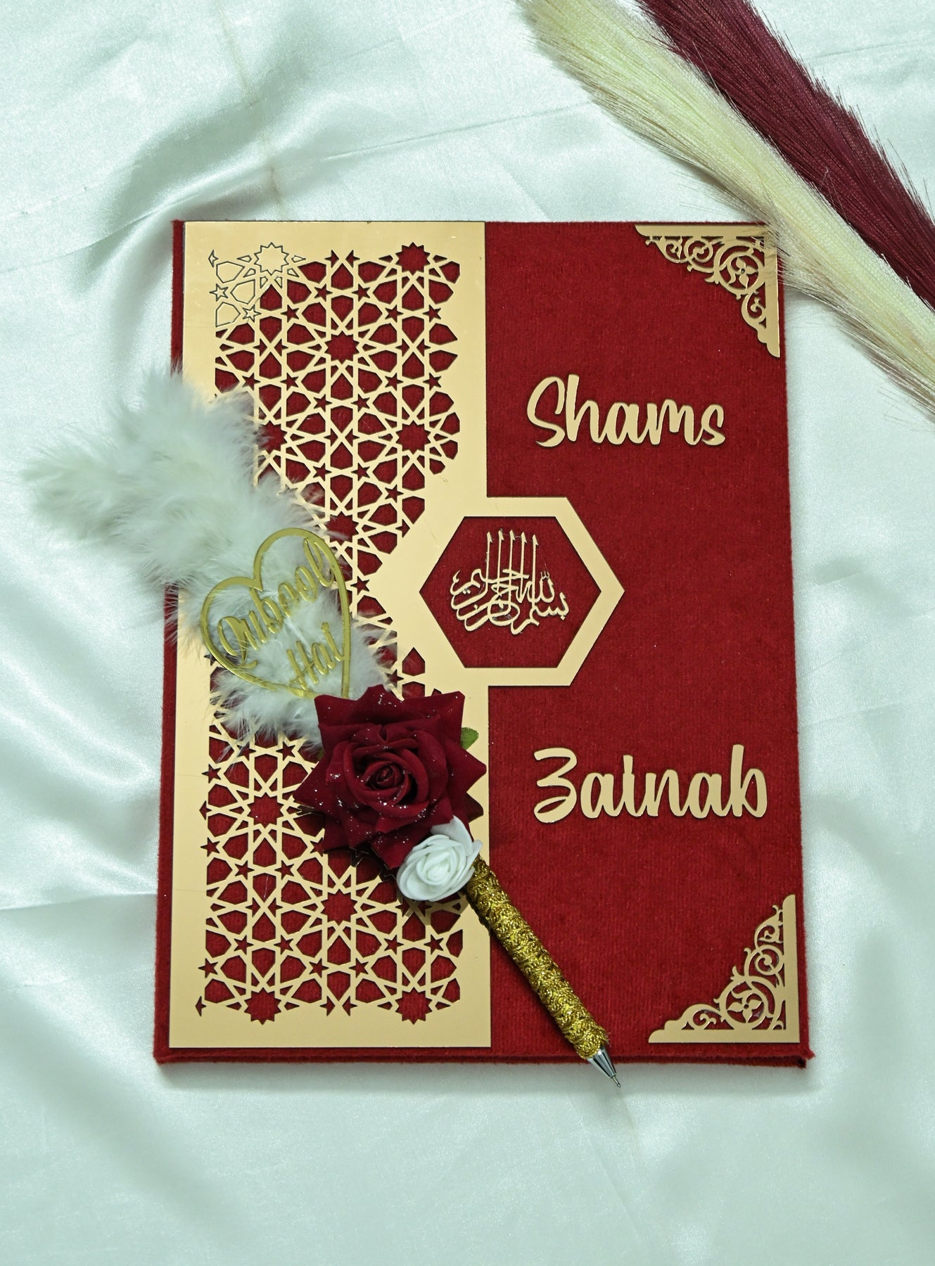 Your Nikah ceremony is a sacred and memorable event that marks the beginning of a beautiful journey together. The Customised Star Design Nikah Nama Gift elevates this cherished moment with a thoughtfully designed Nikah Nama and an elegant Qubool Hai pen, symbolizing your commitment and love. The dimensions of the Nikah Nama is Length – 32 cm, breadth – 23.5 cm. The weight of the Nikah Nama is 400 gms. The material used on the surface is velvet and inside it is made up of foam board.
